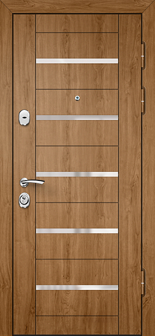 Отделка двери выполнена из МДФ, что придаёт ей элегантный внешний вид и увеличивает устойчивость к механическим повреждениям. МДФ легко очищается, что позволяет долго сохранять дверь в первозданном виде, особенно в условиях частного дома, где часто меняются погодные условия. Вдобавок, дверь оснащена пенопластом повышенной плотности для шумо- и теплоизоляции, а тройной контур магнитного уплотнения надёжно защищает от внешних воздействий.