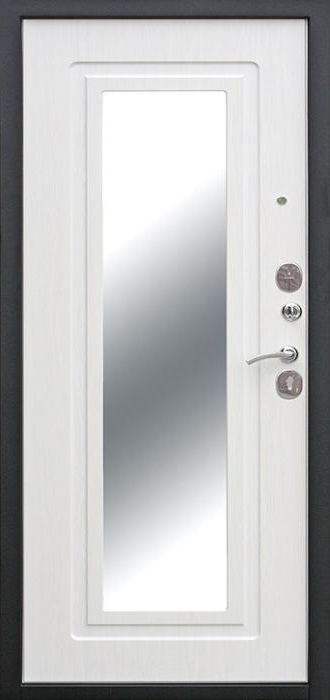 Железная дверь входная в квартиру с зеркалом №68 сочетает в себе надежность металла и практичность продуманного дизайна. Снаружи она покрыта молотковым напылением, известным своей устойчивостью к сколам и царапинам, а также способностью долго сохранять аккуратный внешний вид даже при активной эксплуатации. Внутренняя сторона оформлена накладкой из МДФ, что делает её гармоничным элементом интерьера и добавляет уюта. Встроенное зеркало не только удобно в повседневной жизни, но и визуально расширяет пространство прихожей. Основа конструкции выполнена из профильных труб с листом стали толщиной 2 мм, что гарантирует прочность и долговечность. Два контура уплотнения защищают от сквозняков и уличного шума, а наличие терморазрыва в коробке и полотне препятствует промерзанию в холодное время года. Такая дверь станет надежным и функциональным решением для квартиры, офиса или загородного дома. Железная дверь входная в квартиру с зеркалом №68 от производителя: быстрое изготовление и монтаж в Котельниках, индивидуальные размеры, широкий выбор материалов и фурнитуры, официальная гарантия до 10 лет.