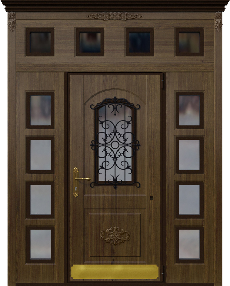 Эта модель выделяется своим масштабом и декоративностью: двухстворчатая дверь со вставками и ковкой №2 подчеркивает парадность входа и придает фасаду респектабельность. Основу составляет прочный каркас из стальных профильных труб с листом металла толщиной 2 мм и ребрами жесткости, что обеспечивает долговечность и защиту. Снаружи и внутри полотно облицовано накладками МДФ, которые позволяют воплотить различные варианты текстур и оттенков, сохраняя устойчивость к механическим повреждениям и влиянию внешней среды. Кованые элементы вносят в образ двери нотку изысканности и индивидуальности, делая ее центральным акцентом всего фасада. Для безопасности предусмотрены два замка турецкого производителя Kale Kilit — цилиндровый и сувальдный, каждый с ригелями, усиливающими защиту. Такая дверь сочетает надежность металлической конструкции с эстетикой классического дизайна, превращая вход в настоящий архитектурный акцент. Двухстворчатая дверь со вставками и ковкой №2 от производителя: быстрое изготовление и монтаж в Котельниках, индивидуальные размеры, широкий выбор материалов и фурнитуры, официальная гарантия до 10 лет.
