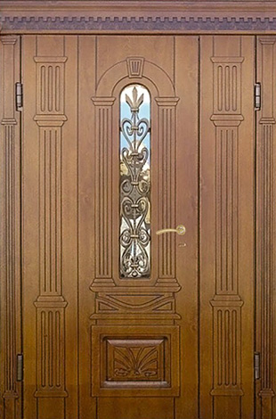 Дизайнерская входная дверь в частный дом с отделкой под дерево и решеткой №17
