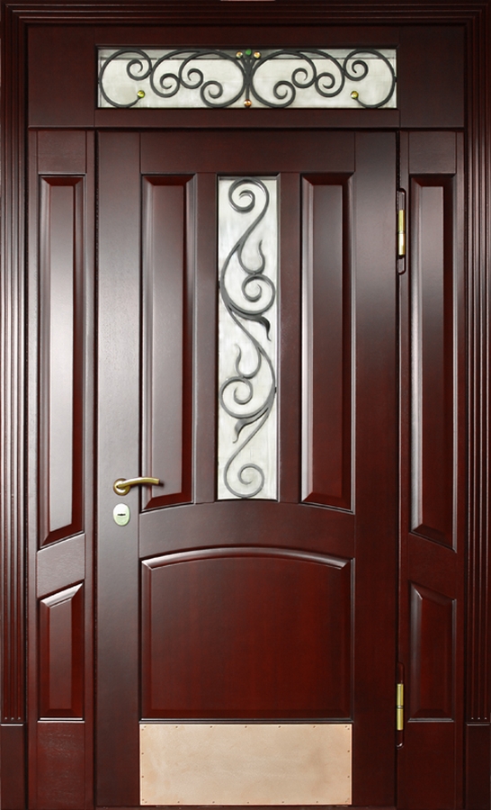 Красивая шпонированная дверь с надежной фурнитурой и ковкой "лоза" №33 идеально дополнит интерьер вашего частного дома или коттеджа. Внешняя и внутренняя отделка выполнены из натурального дерева, что придает двери элегантность и стиль. Профильная труба 50х25 мм используется для каркаса и полотна, а лист металла толщиной 2 мм и ребра жесткости из профильных труб 40х25 мм обеспечивают прочность и долговечность. Несмотря на отсутствие терморазрыва, дверь гарантирует надежную защиту и теплоизоляцию благодаря двум контурам уплотнения. Элементы ковки "лоза" придают двери особое очарование, сочетая практичность с эстетикой. Эта дверь — идеальный выбор для тех, кто ценит стиль, качество и безопасность. Красивая шпонированная дверь с надежной фурнитурой и ковкой "лоза" №33 от производителя: быстрое изготовление и монтаж в Котельниках, индивидуальные размеры, широкий выбор материалов и фурнитуры, официальная гарантия до 10 лет.